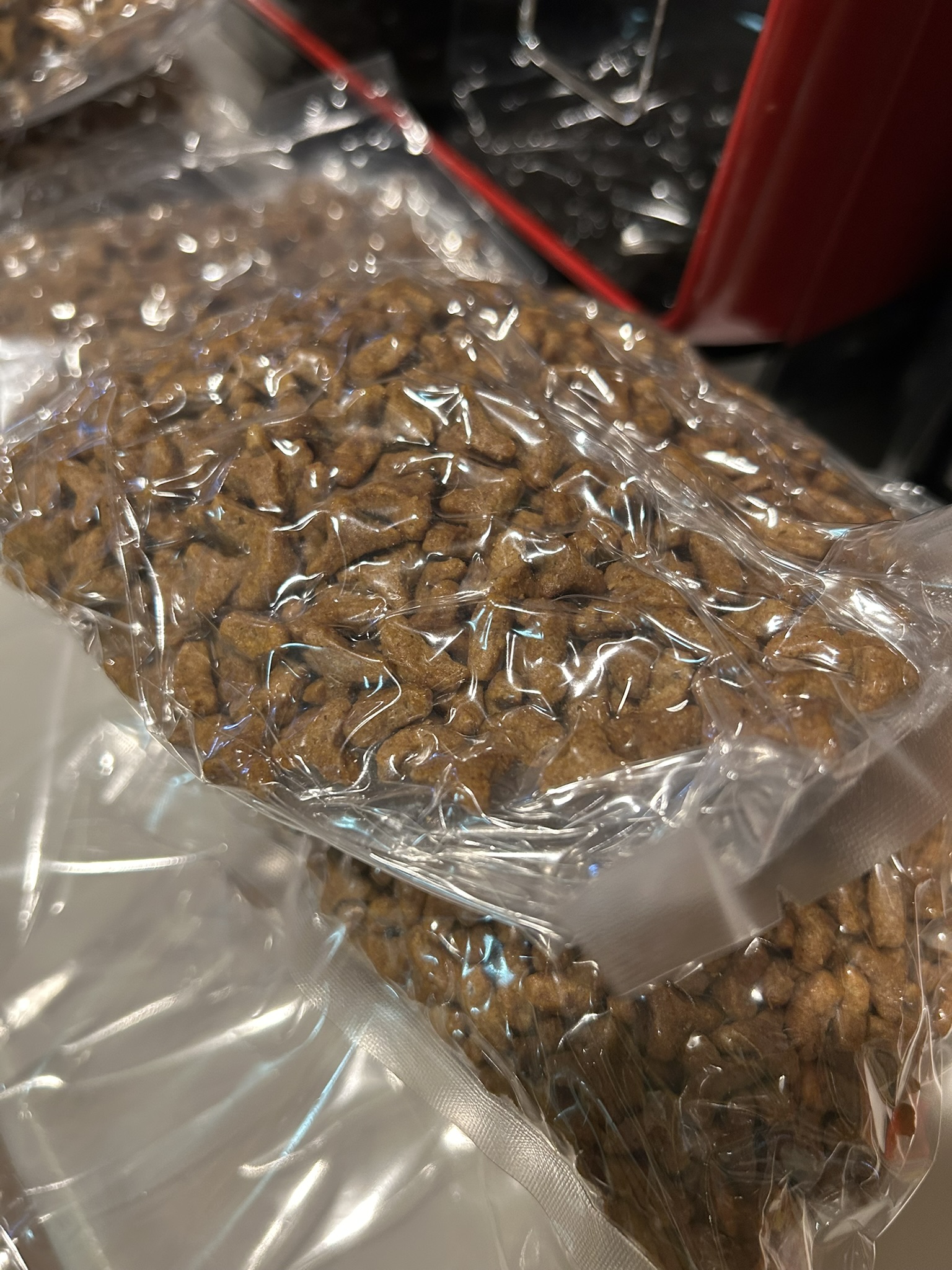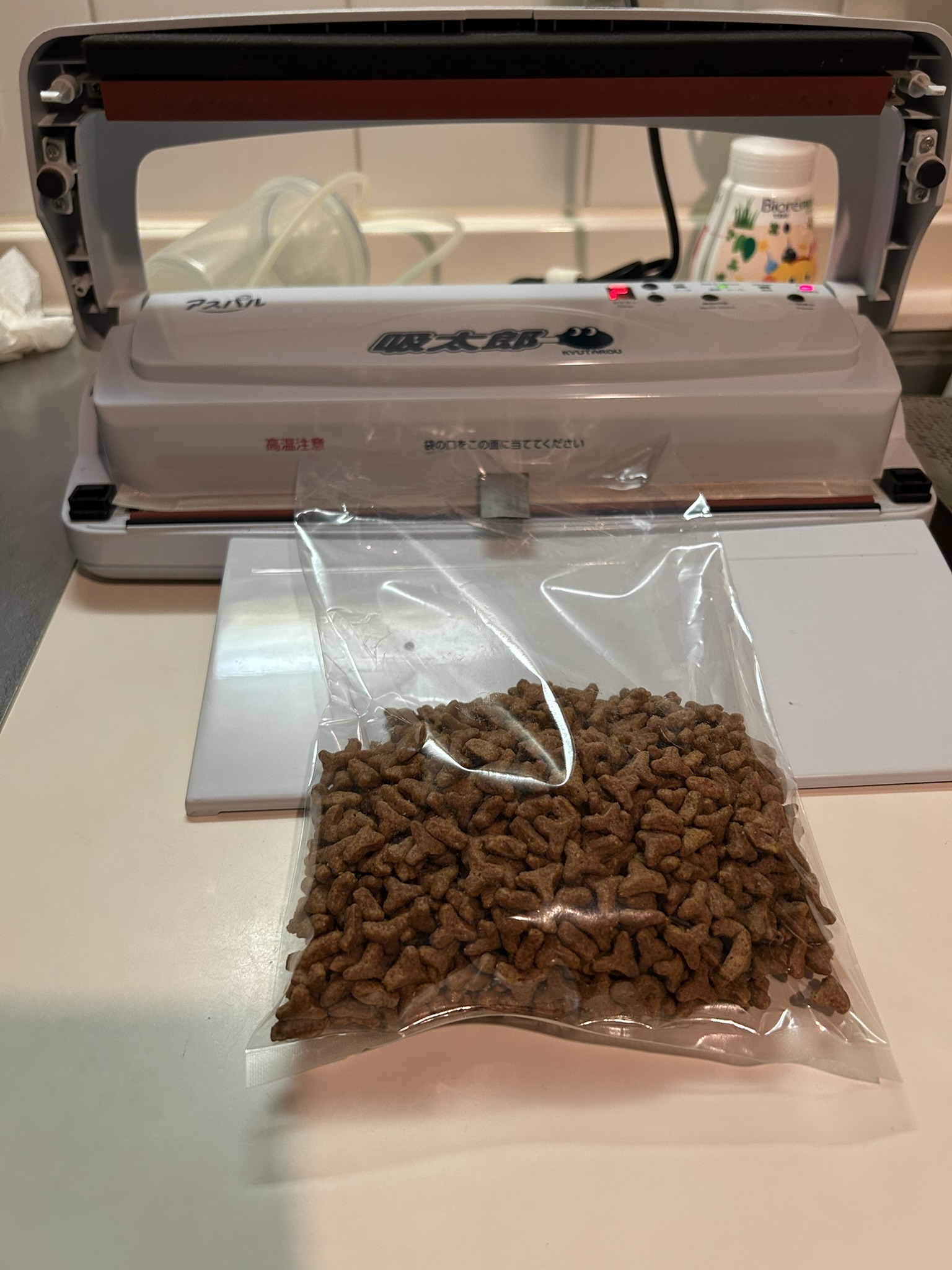 自宅に『Q太郎』という真空パックにする機器があり、それで一つずつ真空パックにしています。コツがあってうまくやると真ん中の写真みたいに空気を抜くことができます。ただし、ドライフードの角で袋に小さな穴が開くことがあって、しばらくすると中に空気が入ってしまうことがありまし。そのため、右のようにさらにもう一度袋に入れ、2重にして真空パックにしています。
