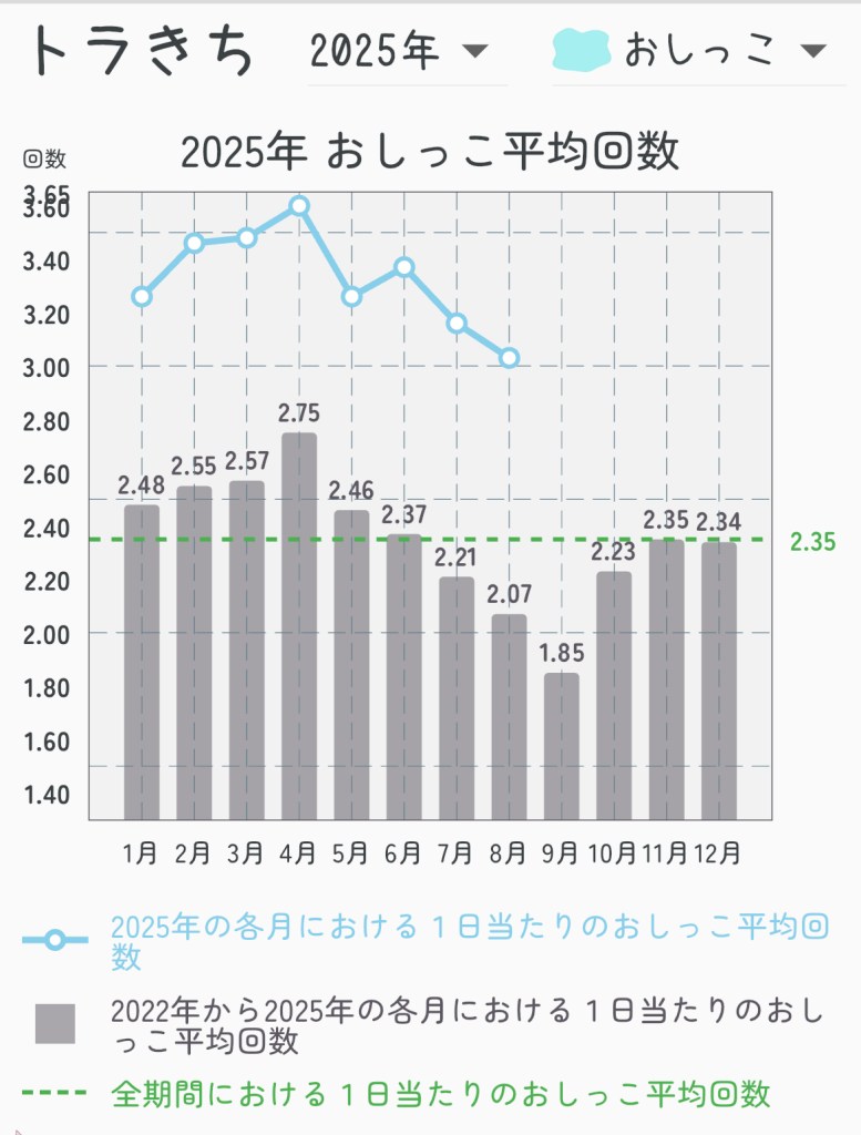 7月よりは、おしっこの回数も減ってはいますが、極端ではなく、また例年の2.07回よりはかなり上回って3.03回を記録しました。