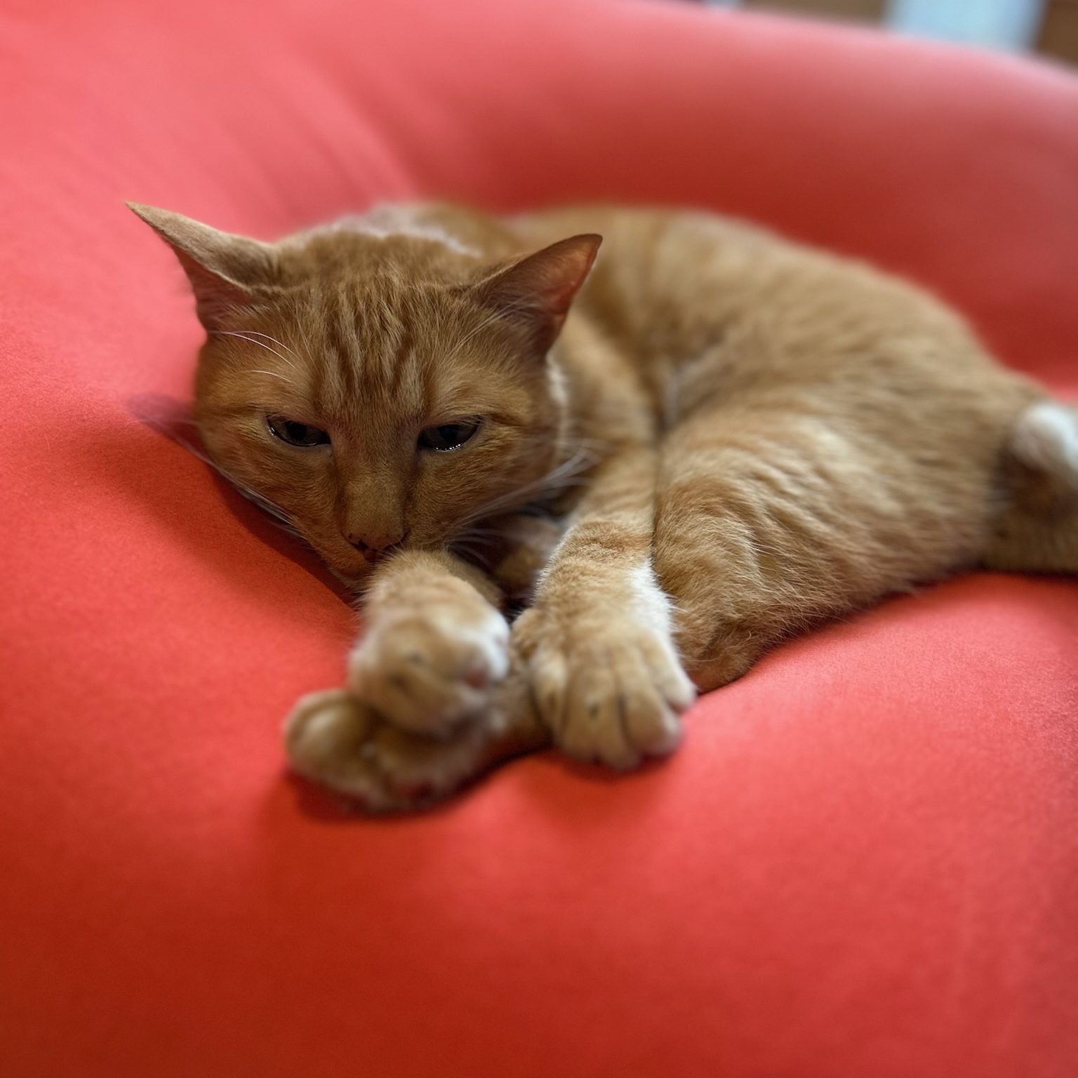そして、最後はお気に入りの椅子…じゃなくて、最近はヨギボーの上でクールダウン。ふわっと沈み込む感触がたまらなくて、ボクの毛皮もリラックスモードに突入。目を細めて「今日もいい運動だったな」って思うんだ。