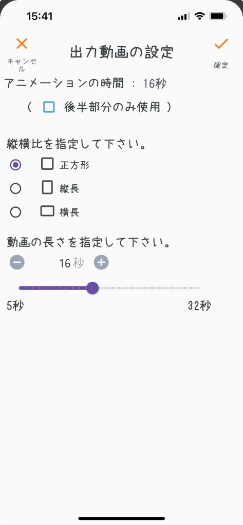 「出力動画の設定」画面の一番上には選択したアニメーションの再生時間が表示されます。殆どのアニメーションは再生時間を16秒で作成してあります(15秒のものもあります)。