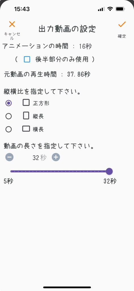 但し、元動画が32秒以下の場合は元動画の長さに依存します(少数点以下は切り捨てされます)。例えば28.56秒の動画を選択した場合、最大28秒の動画を作成出来ます。