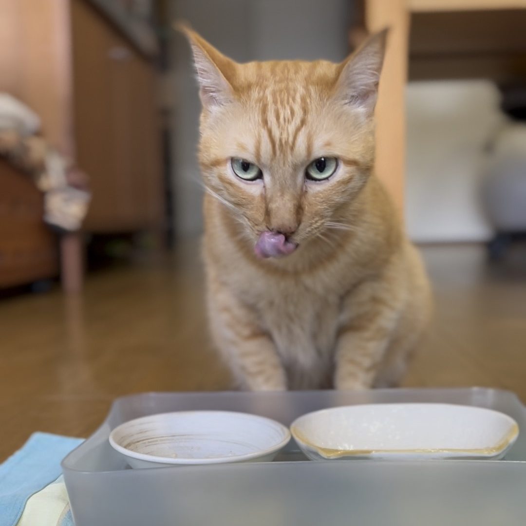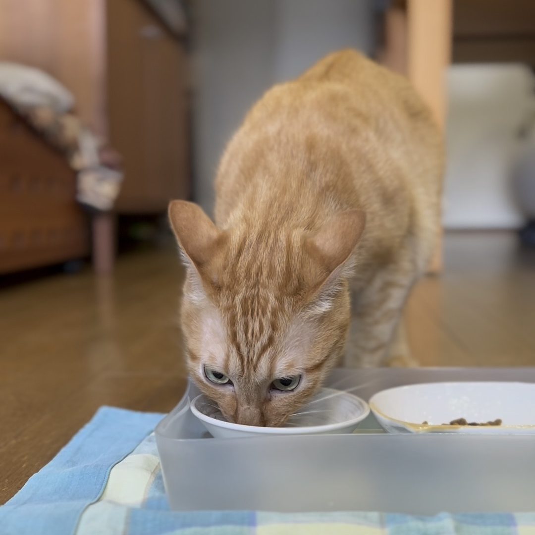 基本のごはんは、カリカリです。そして、1日に1袋のパウチを薄めてスープにしたものを食べています。後はご褒美のシーバと夜のちゅ~るを毎日食べています。