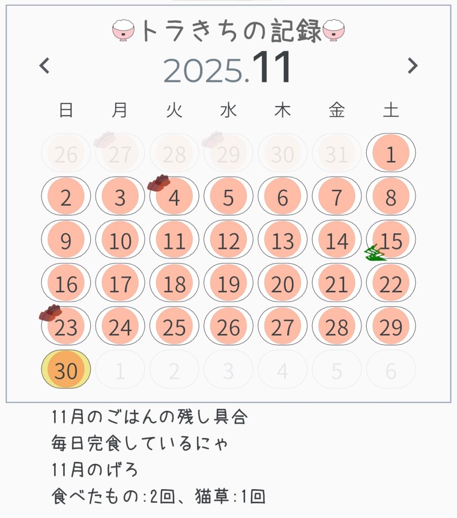 10月はごはんげろの回数が5回と比較的多かったのですが、11月はごはんげろ2回、草げろ1回でだいぶ改善しました。朝の一気食いを防ぐために、朝のカリカリをほんのちょっと減らしたのが功をなしたようです。