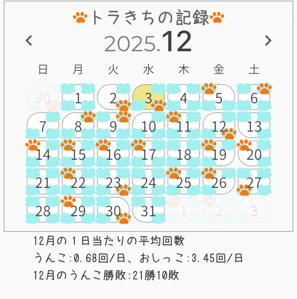 ボクの12月のうんことおしっこの状況をレポートするよ。
