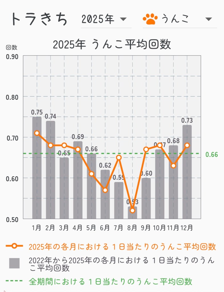 ボクは12月すごくよかったと思っているし、ママたちも大喜びだったんだけど、12月の平均より少なかったんだ。11月は月の平均よりも下回って、年平均はの0.73回/日より、少ない12月は0.68回/日だったんだ。ボクは先月にかなりがんばったと思っていたけど、過去のボクの方ががんばっていたんだね。でもね、年平均の0.66回/日を上回っているから、ママに「トラきち、すごいよ」って褒められたんだ。ボクも誇らしい気分になったよ。