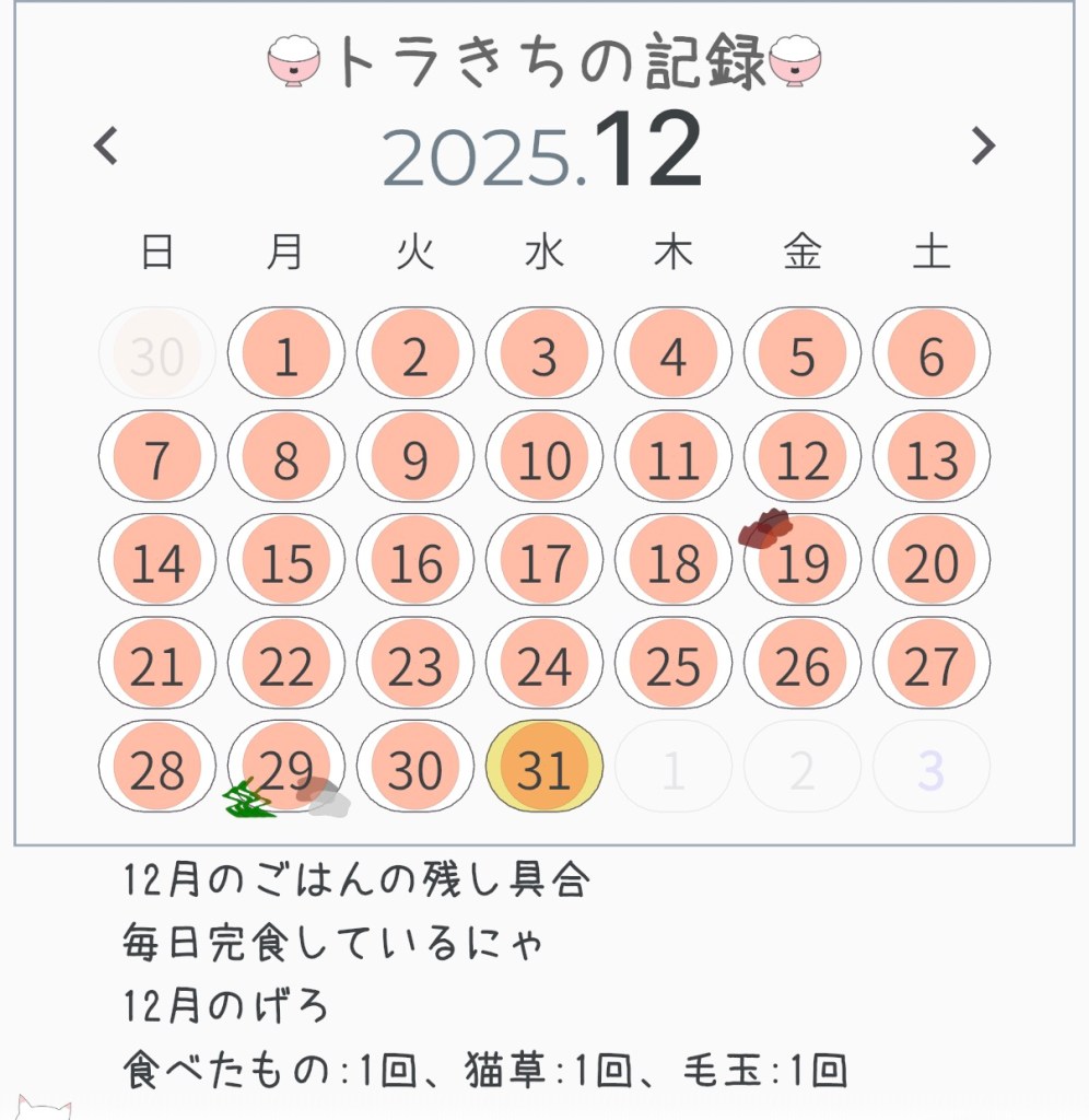 12月はごはんげろが1回だったよ。ごはんげろは、たいてい朝で一気食いするときにしちゃうんだよね。逆にお腹空いているときに草げろとか、でも、あの時は毛玉も吐いたんだよ。そしたら、ママが毛玉を吐いてくれてよかったって。また、褒められちゃったよ。