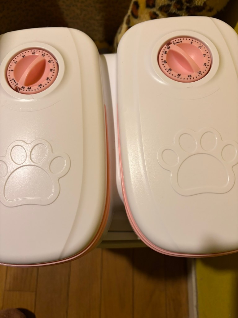 最近、ママが用意してくれた「フタオとパカオ」がその問題を解決してくれた。ボクのお昼ご飯のカリカリを入れておいてくれるんだ。時間になったらフタがパカっと開くわけ。だから、フタオとパカオ。