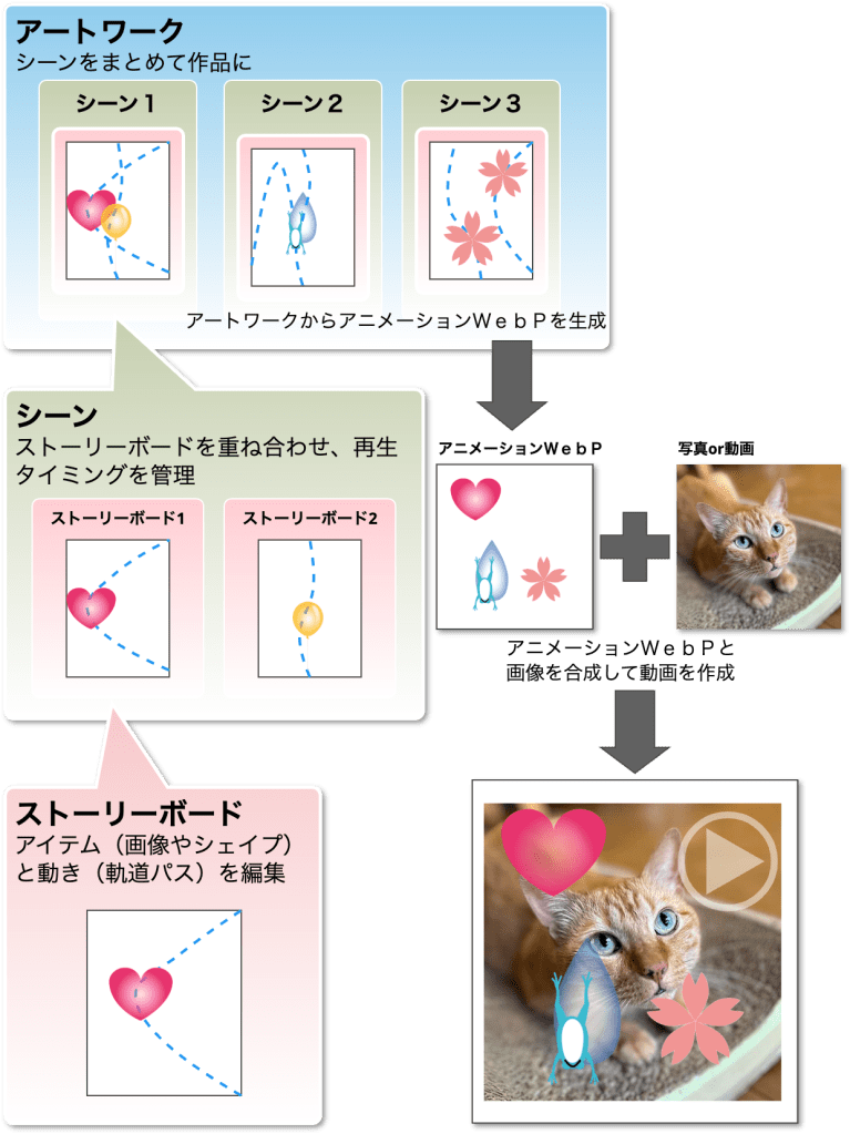 ストーリーボードでは、表示するアイテムの動き(軌道、サイズ、回転等)を設定します。アニメーションの具体的な動作は、ストーリーボードで行います。