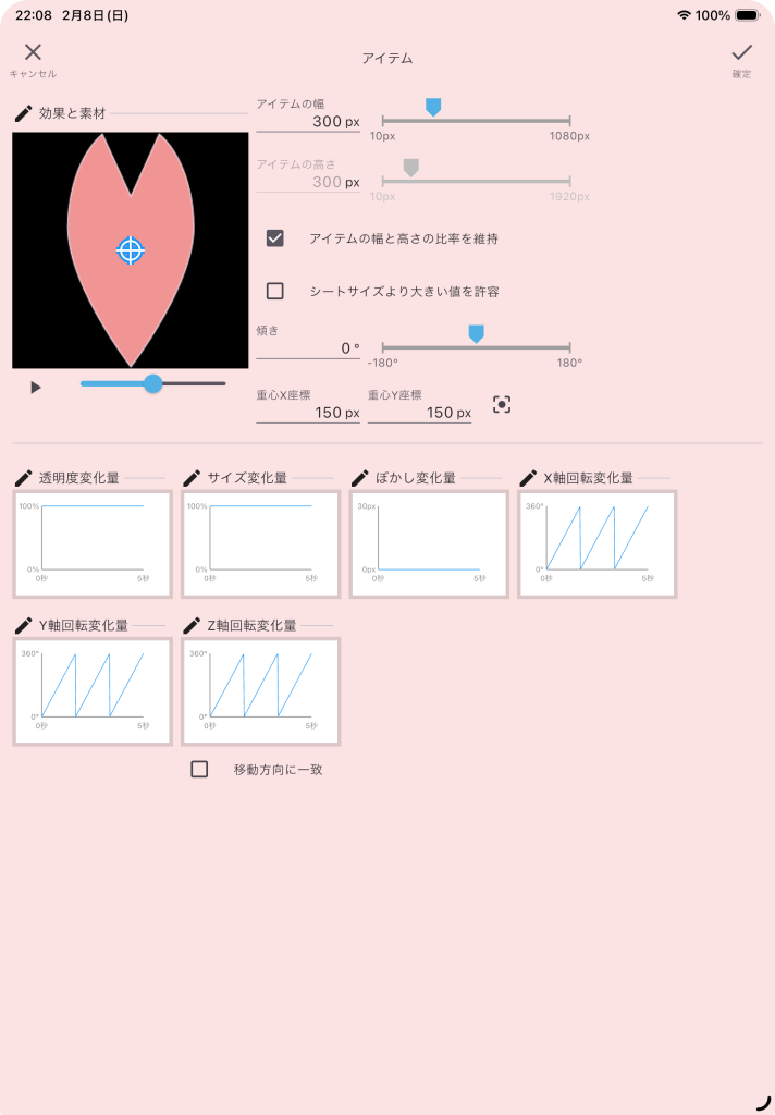 アイテムの編集画面では、「効果と素材」、「サイズ」、「傾き」、「重心」、「透明度変化量」、「サイズ変化量」、「ぼかし変化量」、「x軸回転変化量」、「y軸回転変化量」、「z軸回転変化量」の設定が出来ます。