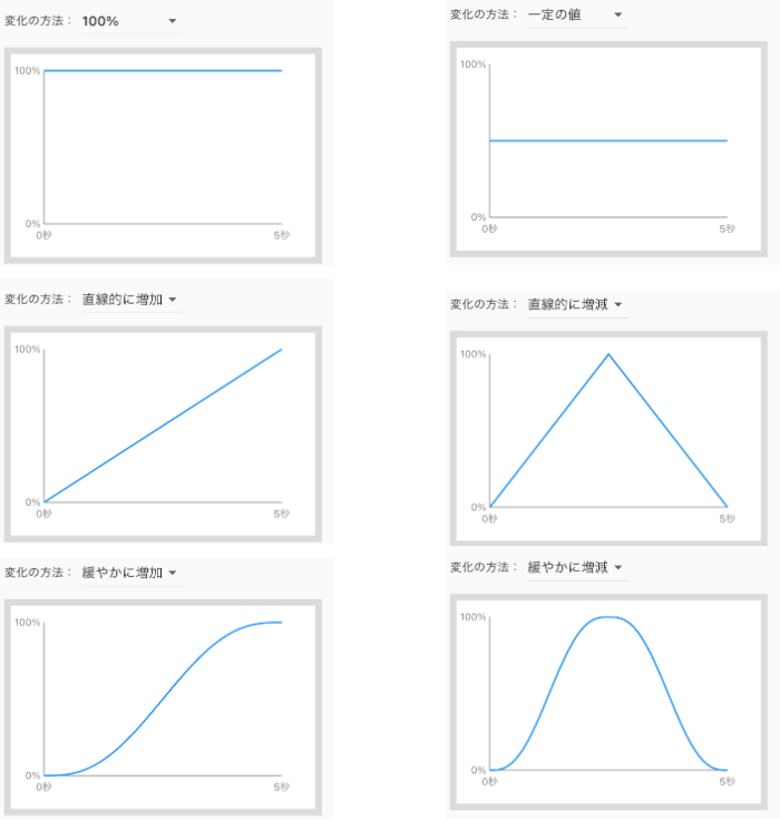 透明度変化量とサイズ変化量の場合、グラフの縦軸は0%から100%になります。横軸は、ストーリーボード再生の経過時間となります。ぼかし変化量の場合、グラフの縦軸は0pxから30pxになります。x軸回転変化量、y軸回転変化量、z軸回転変化量の場合、縦軸は、0°から360°の値になります。