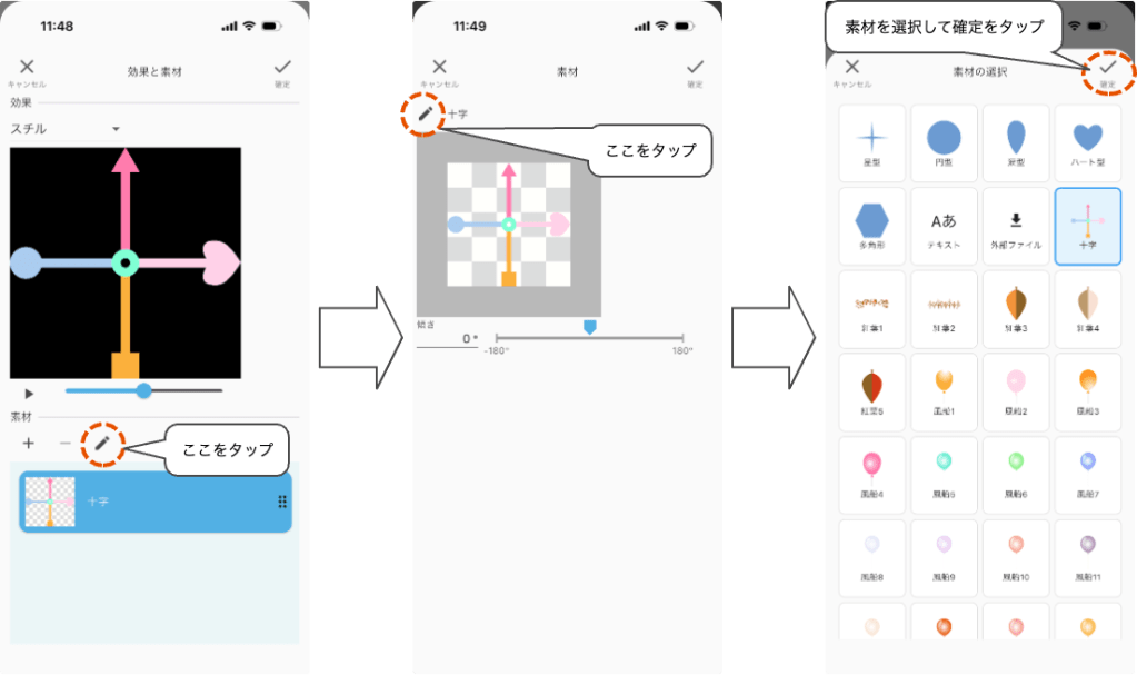素材は、シェイプ(星型、円型、涙型、ハート型、多角形)、テキスト、外部ファイル、若しくは予め用意された画像から選択します。外部ファイルを選択することにより、pngファイルを読み込むことが出来ます。