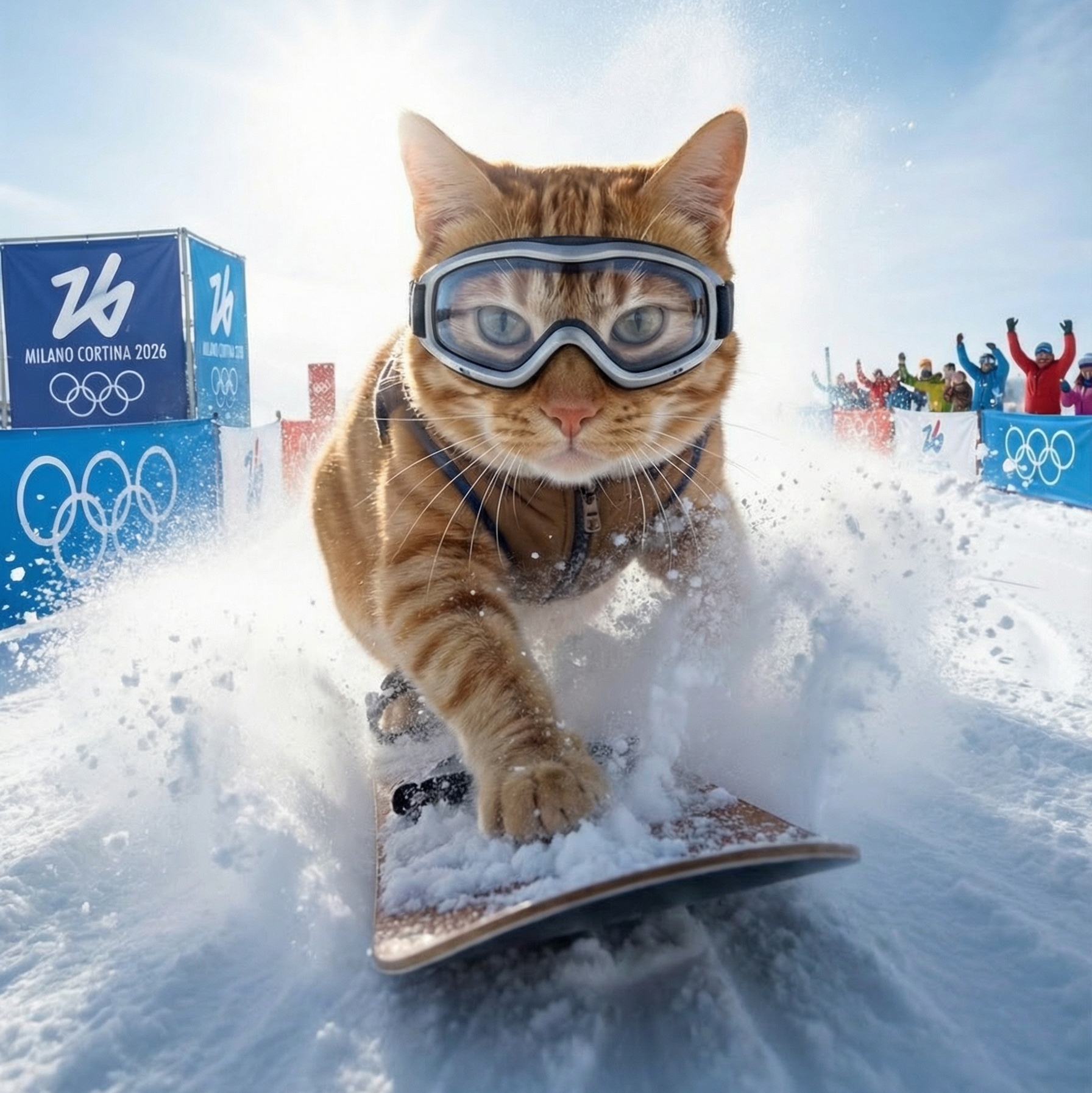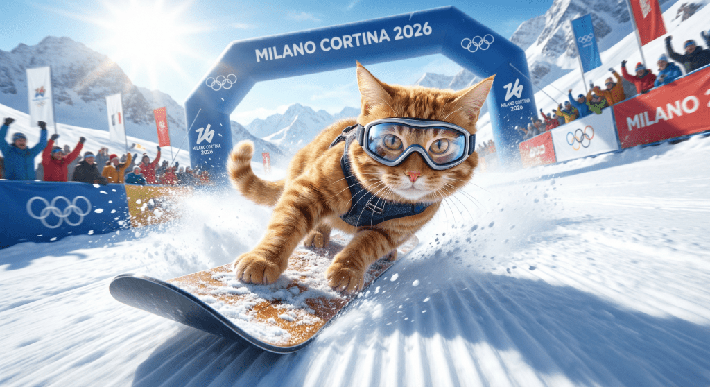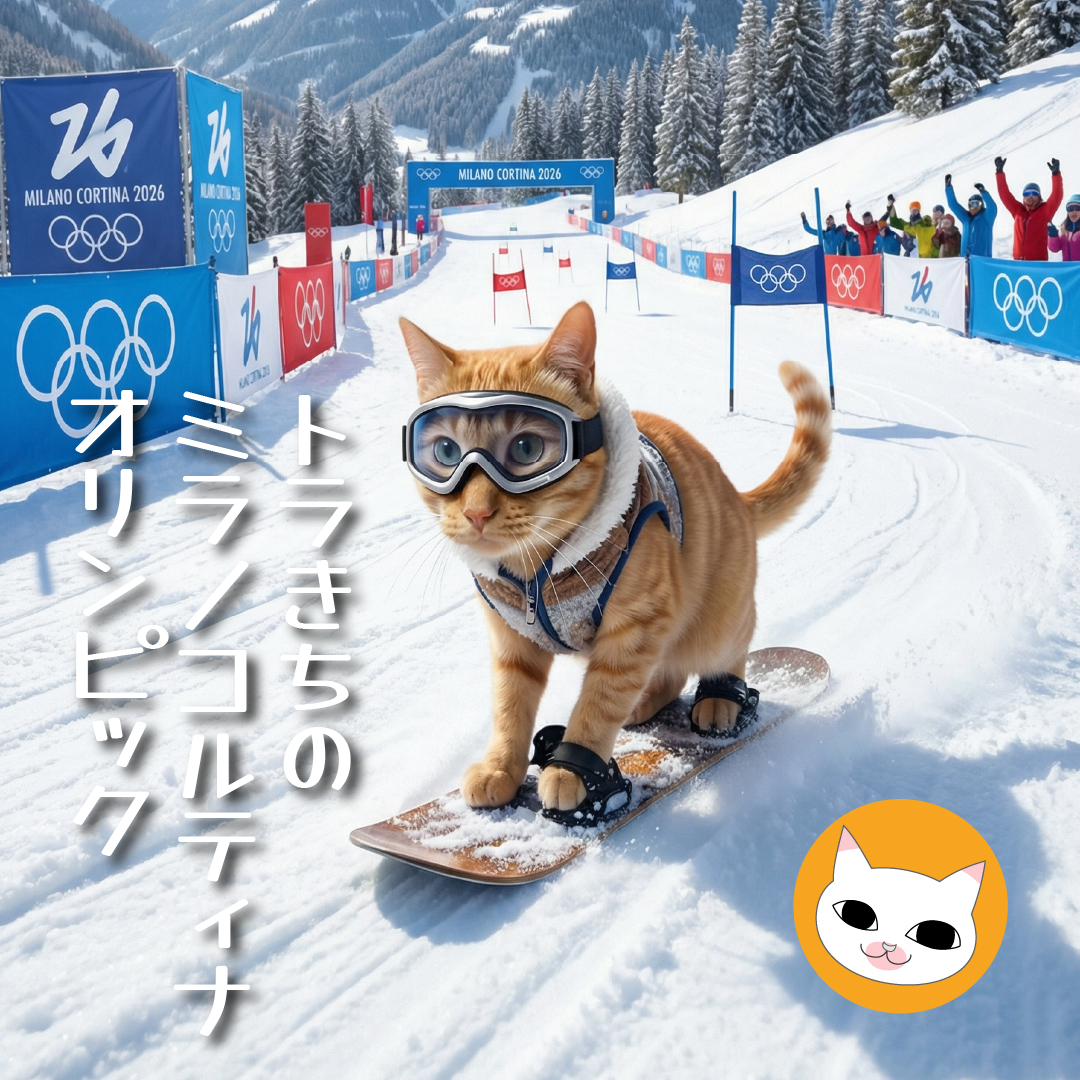 ミカ:さあ、始まりました!ミラノ・オリンピック、スノーボード男子“にゃん部門”決勝戦!注目のルーキー、トラきち選手がスタート地点に立っています!