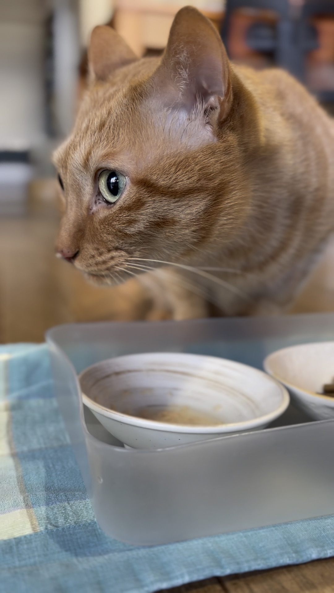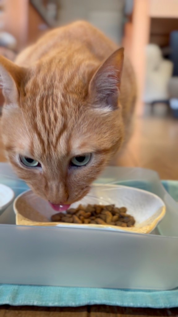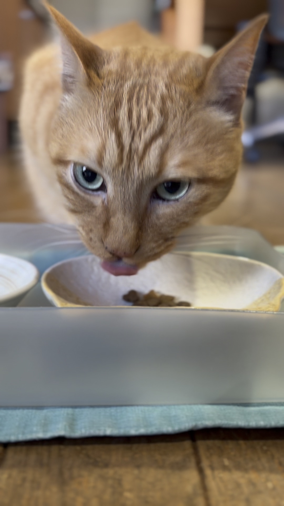 基本のごはんは、カリカリだよ。そして、1日に1袋のパウチを薄めてスープにしてくれたものを飲んでる。カリカリはしっかり噛んで食べるんだ。
