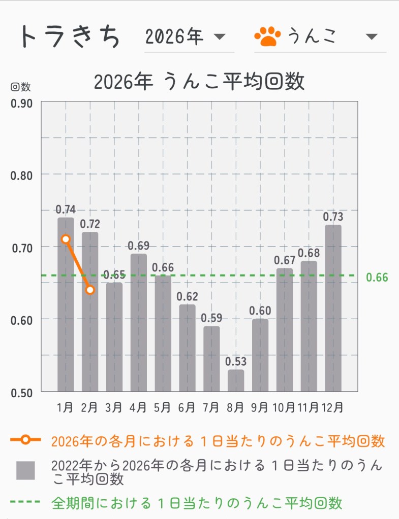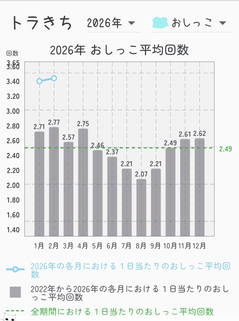 次に、【おげんこキャット】の統計で例年の状況と比較だけど、平均より下がっちゃった。3月はがんばるからね。
