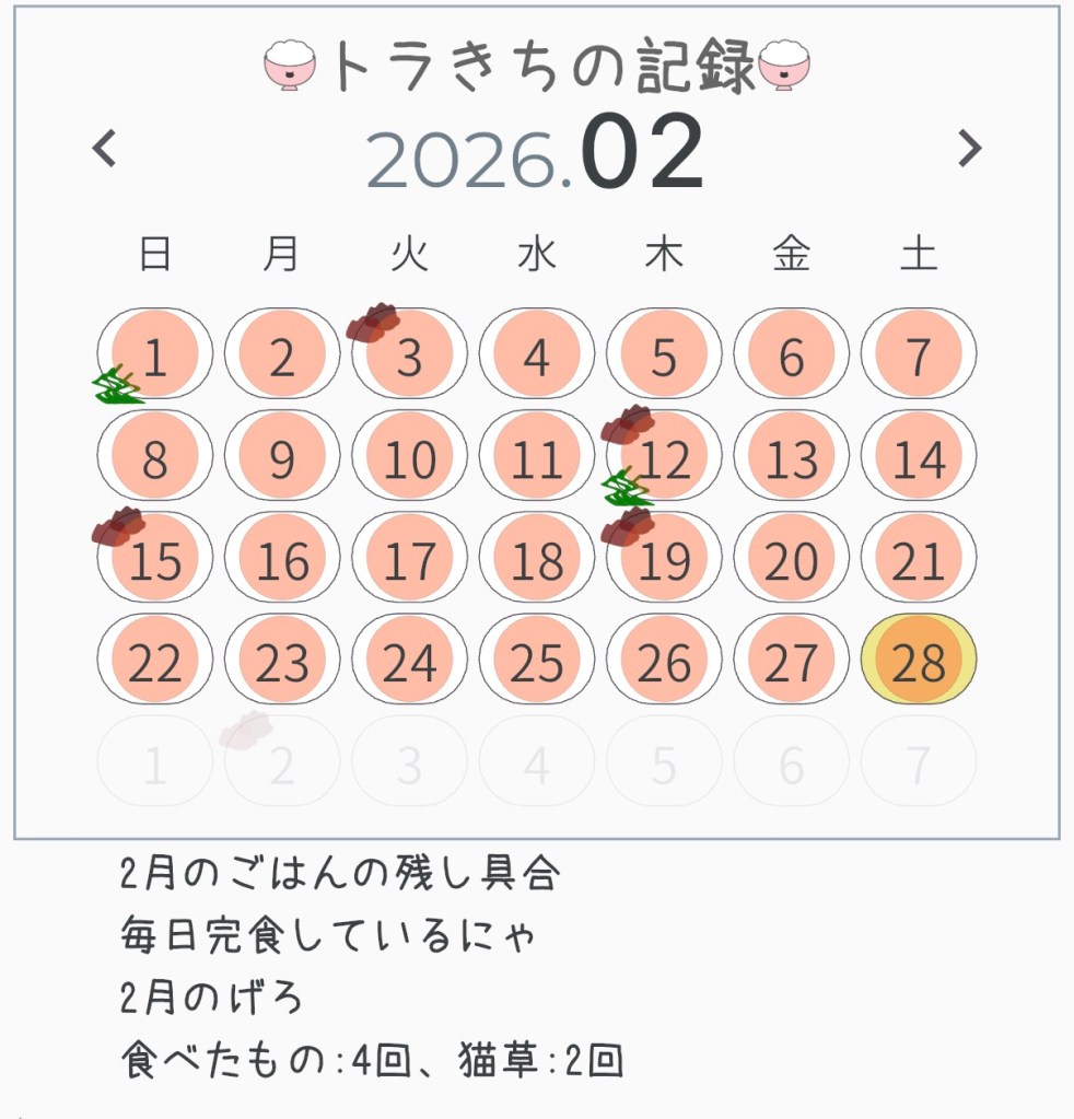 2月はごはんげろが4回、草げろが2回あった。1月と同じくらいだね。