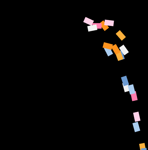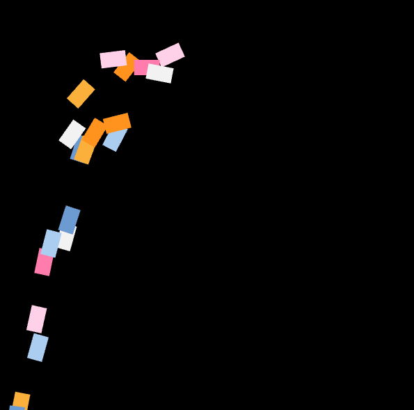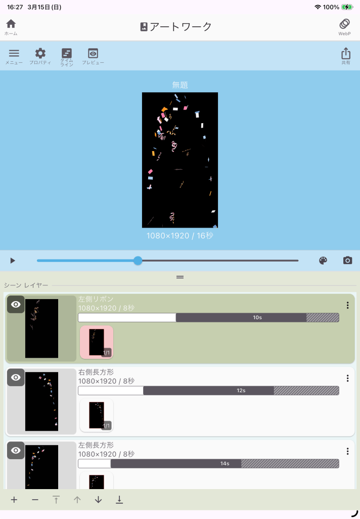 Ornamenterで予め用意してあるサンプルのアートワーク「紙吹雪 9:16」では、アーチやその他の効果を利用して紙吹雪のアニメーションを表現しています。