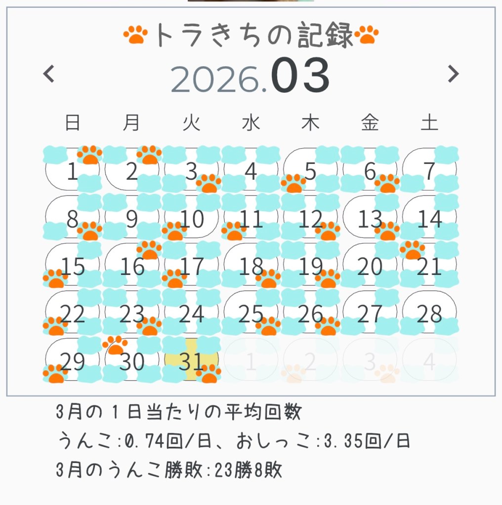 3月のうんこ成績は23勝8敗で、1日当たりのうんこ回数は0.74回で毎週5勝以上っていう、ものすごい好成績だったんだ。毎日、ママは大喜びしたし、ボクもご褒美をいっぱいもらった。