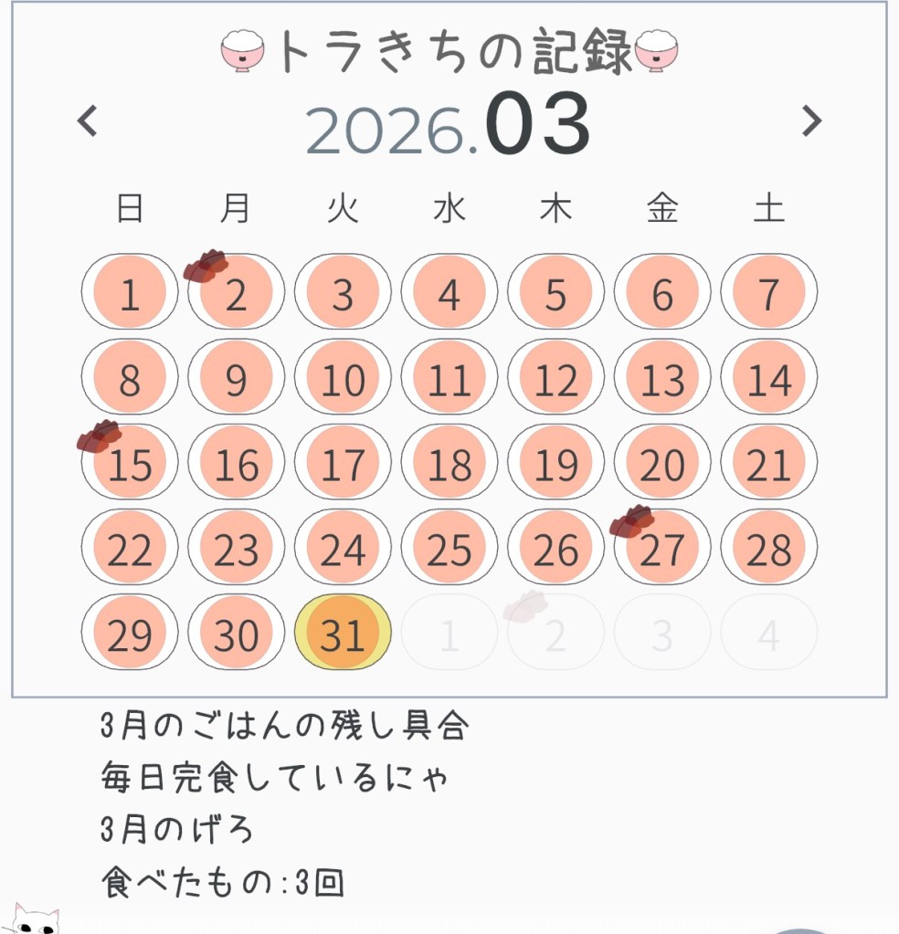 3月はごはんげろが3回で2月よりは減ったよ。げろする時って、いつも朝ごはんの後でさ、なんか急いじゃって、ケロっちゃうんだ。だから、朝のカリカリはママにちょっと少な目にされちゃうんだけど。。