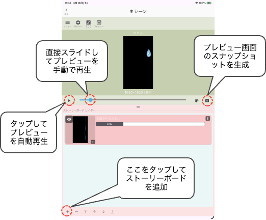 シーンのプロパティ(シーン名、再生時間)の設定が終わったら、次にストーリーボードの編集を開始します。