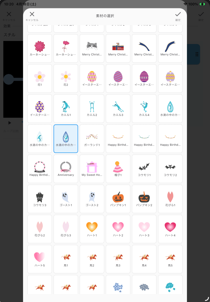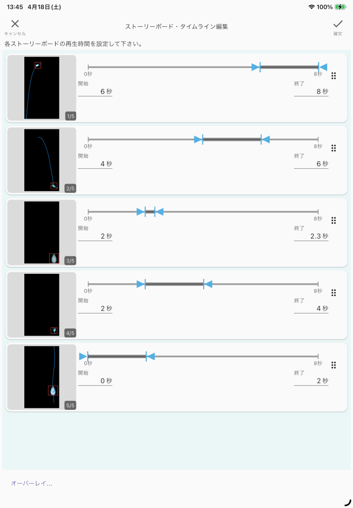 ストーリーボードのタイトルは、「水滴の中のカエル」にします。再生時間は、開始0秒から2秒間をセットします。設定を変更したら必ず画面右上隅の「☑️確定ボタン」をタップして下さい。「×キャンセルボタン」をタップすると編集内容は破棄されます。