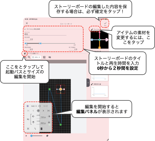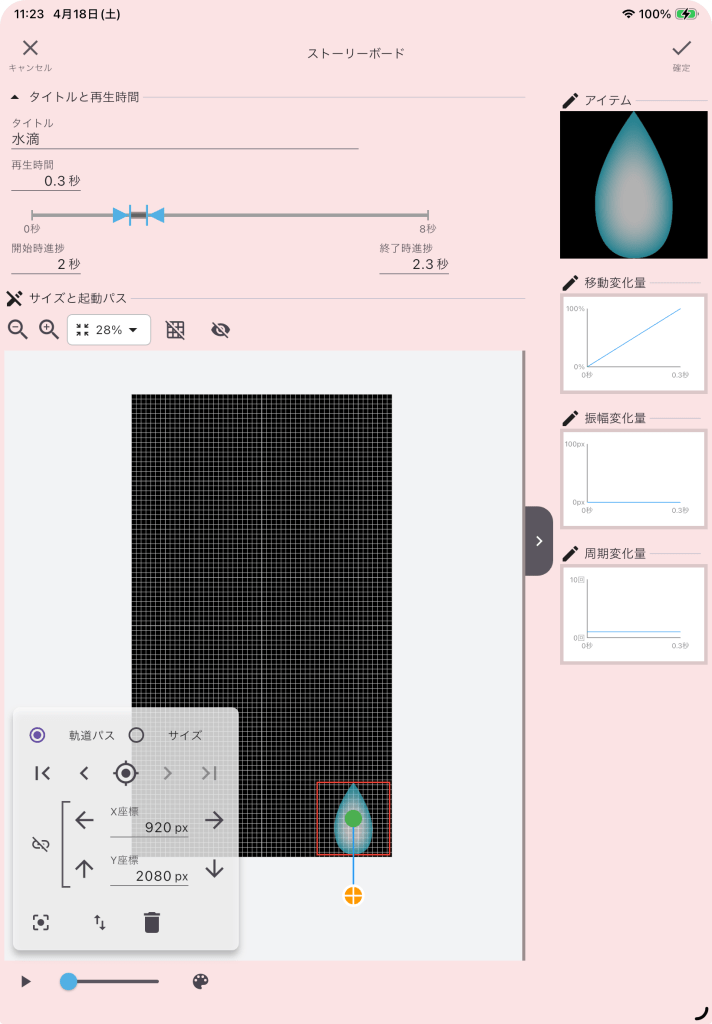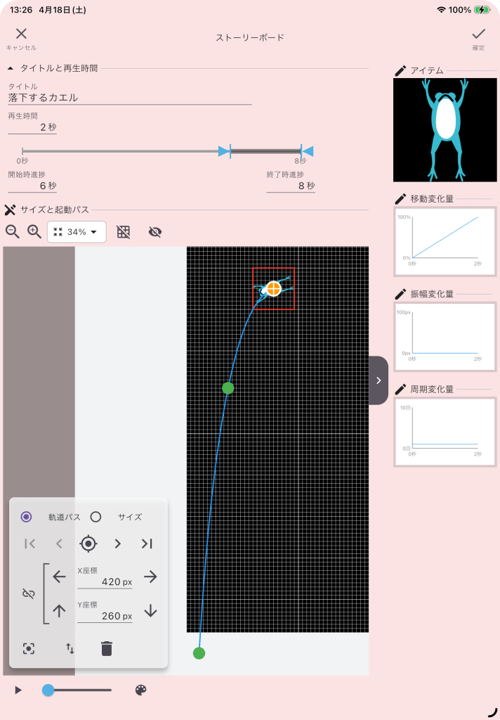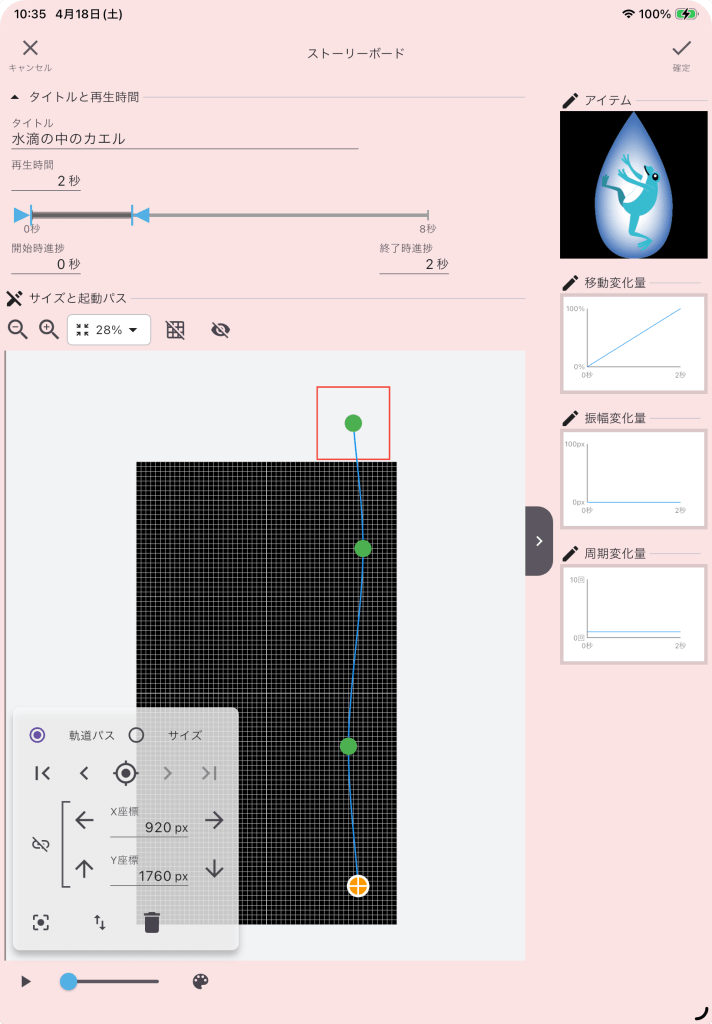 右上の見えない位置から開始して、右下隅に移動する様に軌道パスを編集します。直線的ではなく緩やかにカーブを描いて落下する感じにします。軌道パスの最後のポイントの座標(X座標920px、Y座標1760px)の値は、次のストーリーボードでも使います。編集が完了したら、必ず「☑️確定ボタン」をタップしてストーリーボードの編集画面を閉じて下さい。