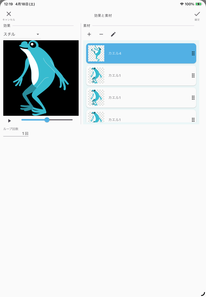 アイテムの素材には、カエル4、カエル1、カエル1、カエル1の4つの素材を追加します。カエル1を3つも追加したのは、1つ当たりの再生時間が2秒➗4🟰0.5秒にする為です。見た感じは、カエル4が0.5秒間、その後にカエル1が1.5秒間再生されている様に見えます。
