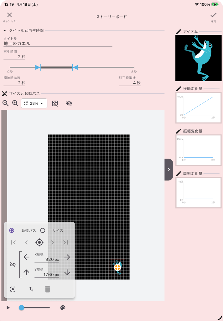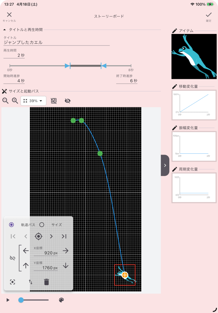 「ジャンプするカエル」の軌道パス開始位置は、「地上のカエル」の位置と同じ位置(X座標920px、Y座標1760px)です。アイテムサイズも同じ200px✖️200pxにします。再生時間は、開始4秒後から2秒間にします。