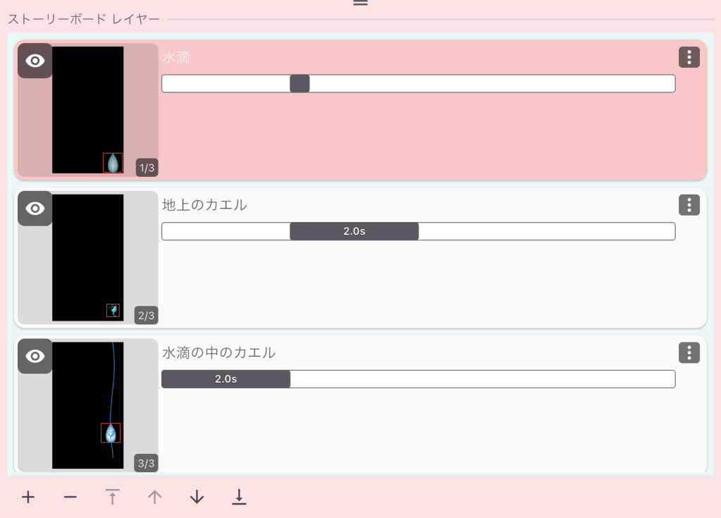 水滴の上にカエルがいるとチョット不自然なので、ストーリーボードレイヤーの画面では、「水滴」、「地上のカエル」、「水滴の中のカエル」の順序にします。