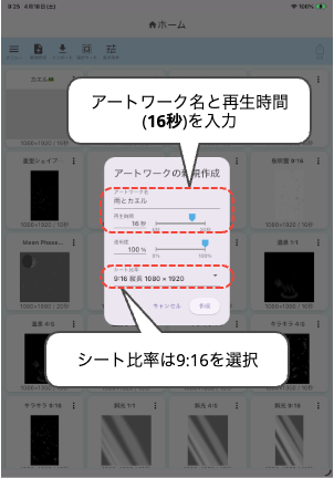 先ずは、アートワークを新規作成します。アートワーク名は、「雨とカエル」にします。再生時間には16秒を設定します。シート比率は9:16を選択します。この内容は、後からアートワークのプロパティ設定画面から変更できます。