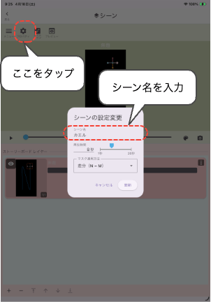 新規作成されたアートワークにはシーンが1つ追加されています。シーン名を「無題」から「カエル」に変更しておきます。シーンの再生時間は8秒(16秒の半分)のままにしておきます。