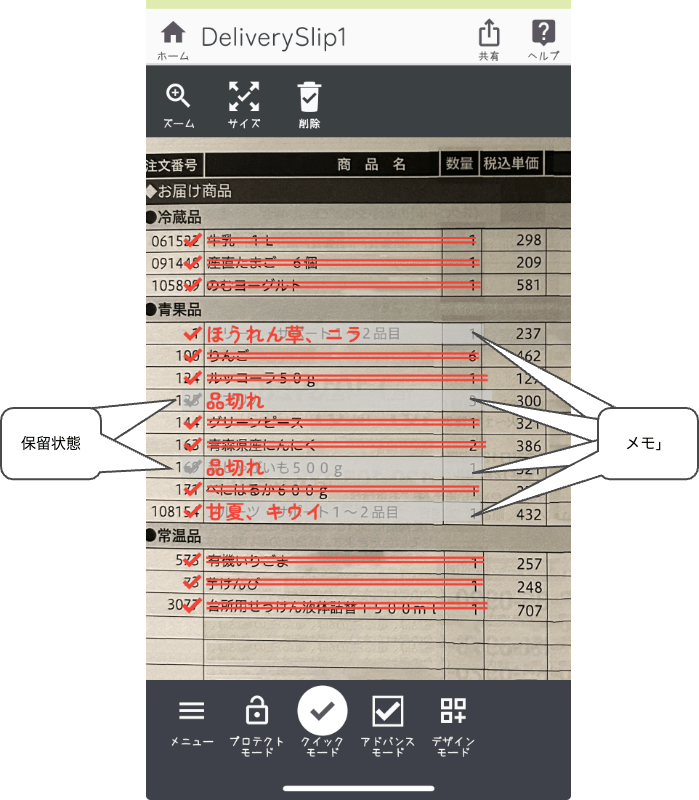 はじめてチェックシートを開くとクイックモードで表示されます。クイックモードで画面をタップするとタップした場所にチェックマークが付きます。チェックマークをもう一度タップするとチェックマークは消えます。