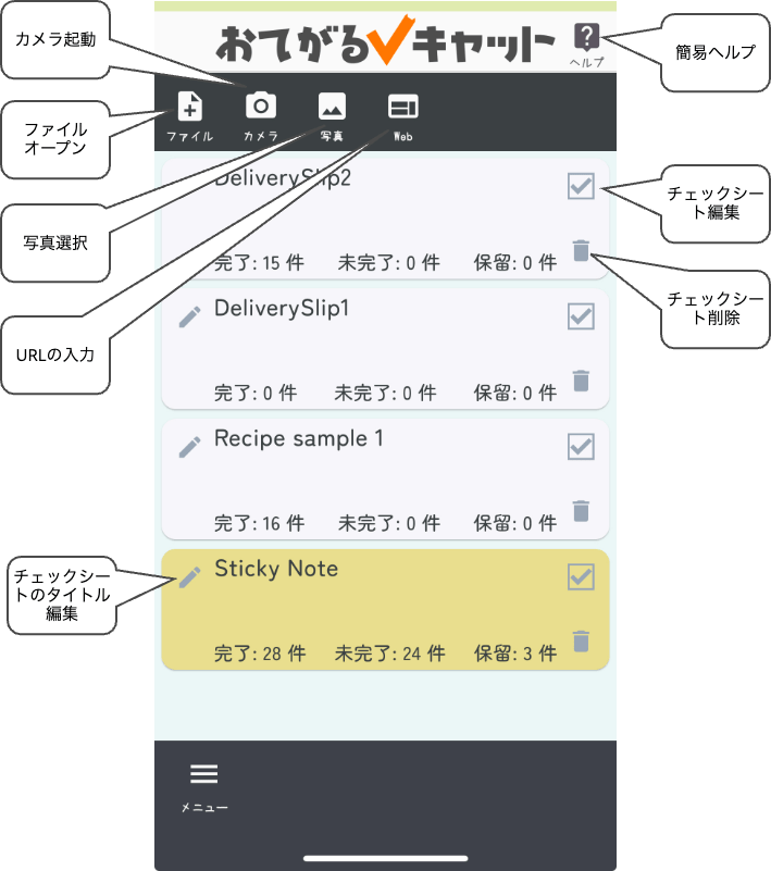 アプリを起動するとホーム画面が表示されます。ホーム画面の上部にはチェックシート(写真、PDF、テキストファイル、Webページなど)を読み込む為のアイコンが並んでいます。ホーム画面中央にには、読み込んだチェックシートの一覧が表示されます。