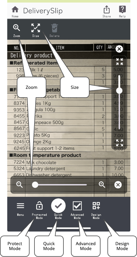 In protected mode, zoom operations are possible. You can enlarge/reduce the screen. Tap the zoom icon to display the zoom slider. Slide the slider left or right to zoom in or out of the screen.