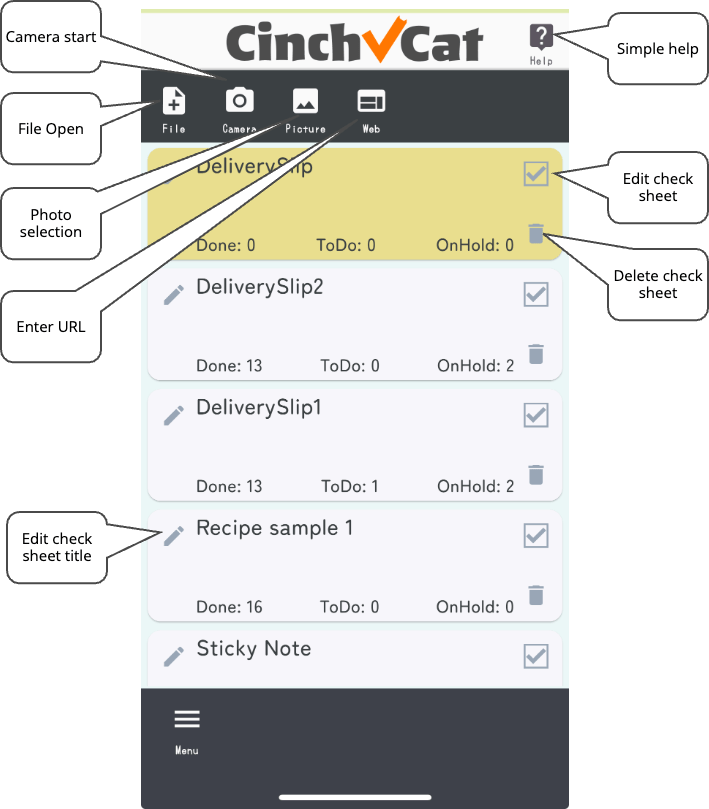 When you start the app, the home screen will be displayed. At the top of the home screen, there are icons for loading checklists (photos, PDFs, text files, web pages, etc.). A list of loaded check sheets is displayed in the center of the home screen.