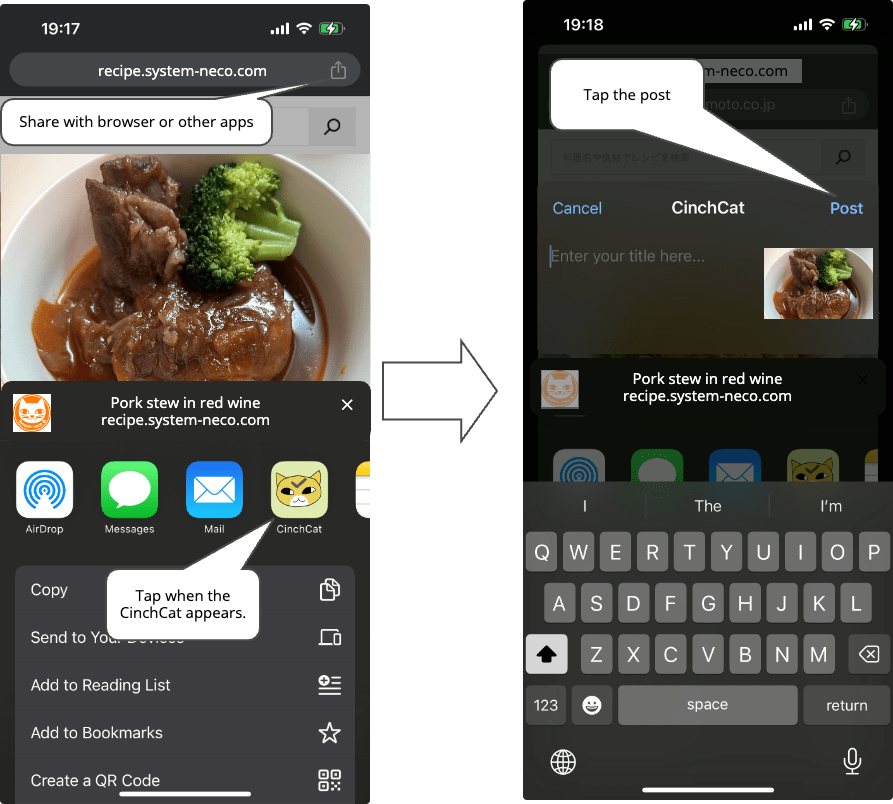 You can also post to “CinchCat” using the sharing function of other apps (browser, recipe app, etc.).