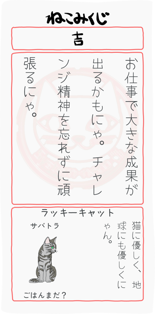 おまけ機能として、「当たるも八卦当たらぬも八卦」な、ねこみくじを引けます。1日の運勢を占ってみて下さい(あたらないですけど)。おみくじの文章部分をタップすると文章を読み上げます。