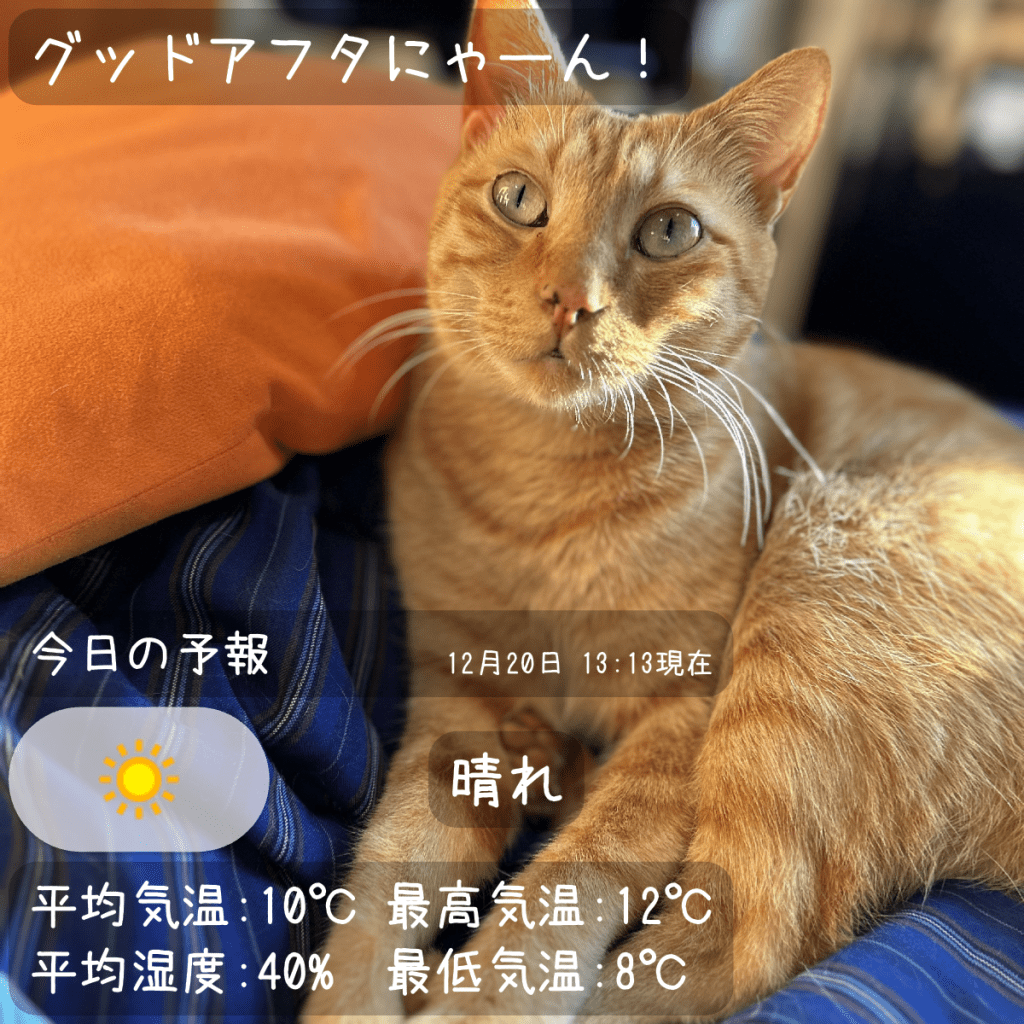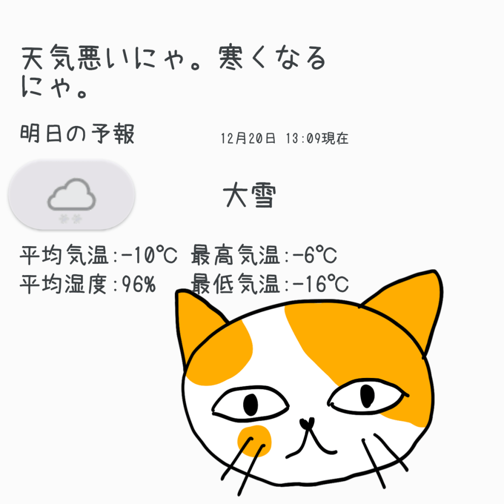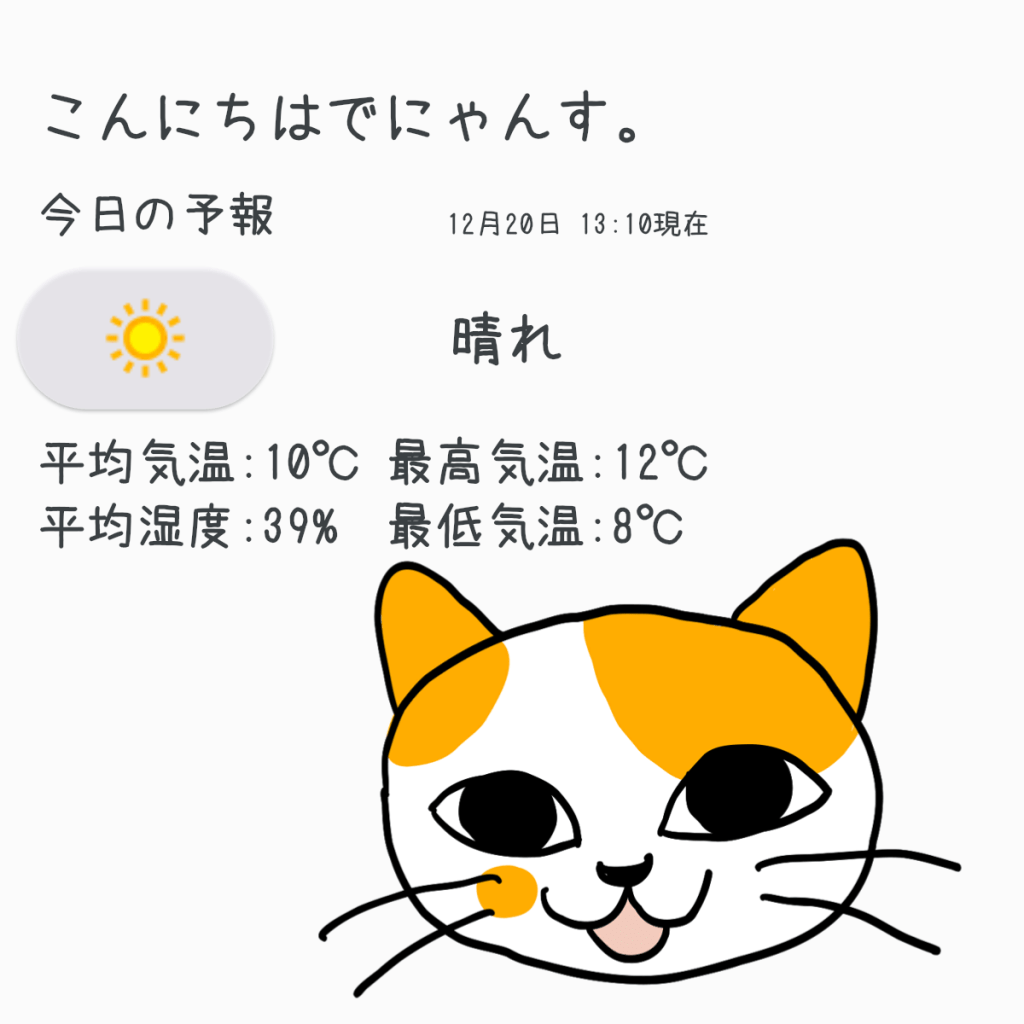 天気予報と挨拶文、ニャンコの絵を表示します。緩い感じで、ホッコリお天気を確認出来ます。