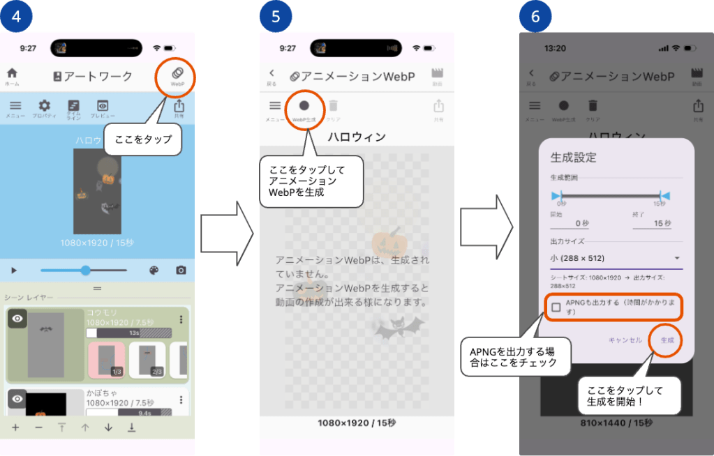 アニメーションWebPファイルの出力可能なサイズは、1:1(1080×1080、810×810、512×512)、9:16(1080×1920、810×1440、288×512)、4:5(1080×1350、810×1014、410×512)、16:9(1920×1080、1440×810、512×288)、1.91:1(1280×670、960×504、512×268)です。
